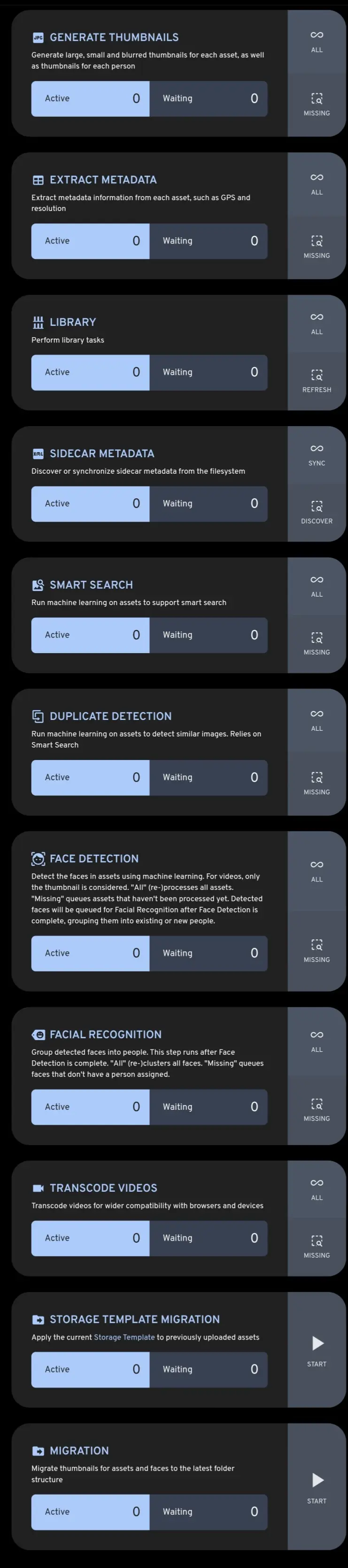 When a new asset is uploaded it kicks off a series of jobs, which include metadata extraction, thumbnail generation, machine learning tasks, and storage template migration, if enabled. To view the status of a job navigate to the Administration -> Jobs page.